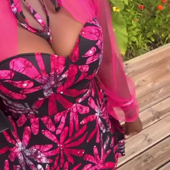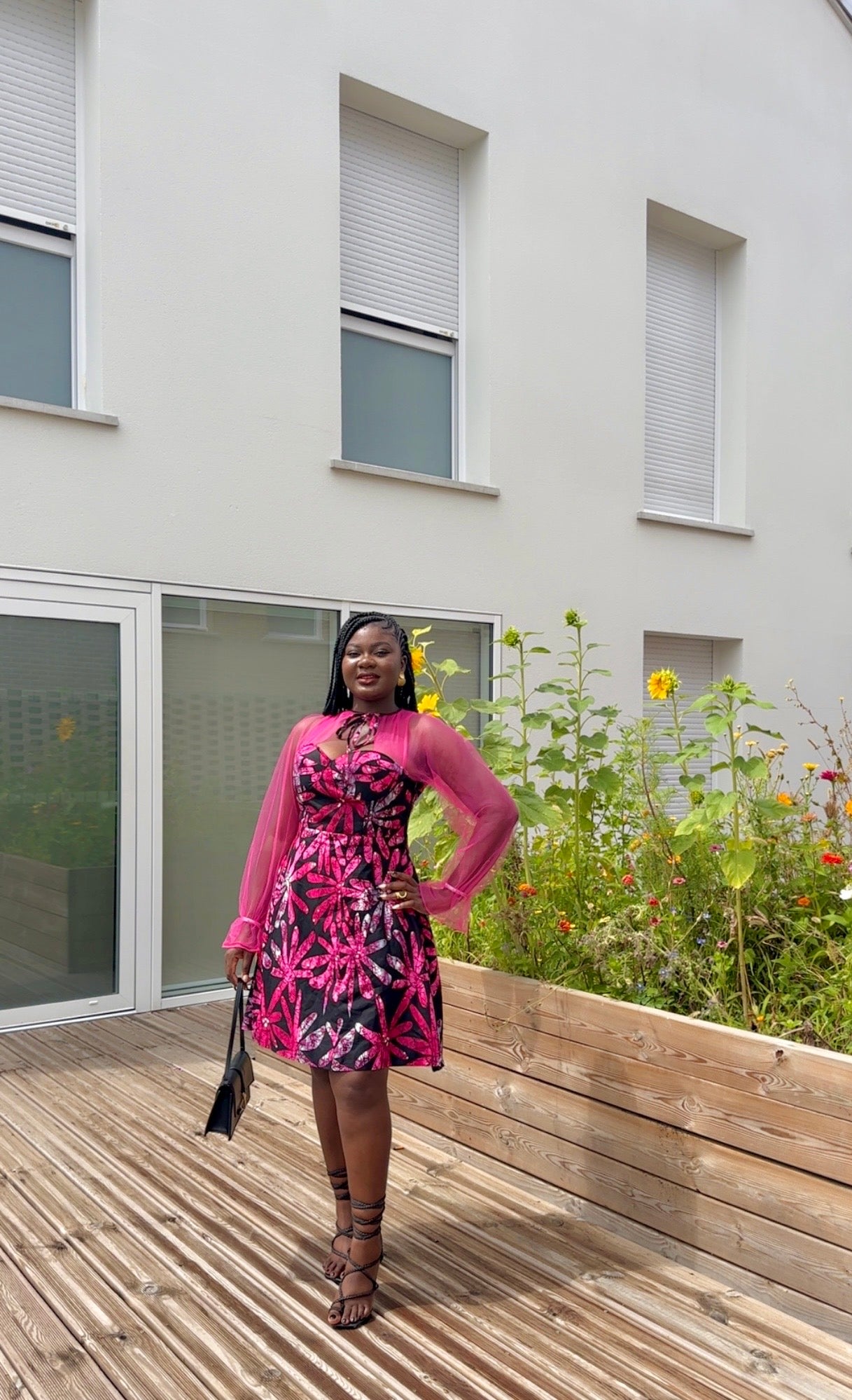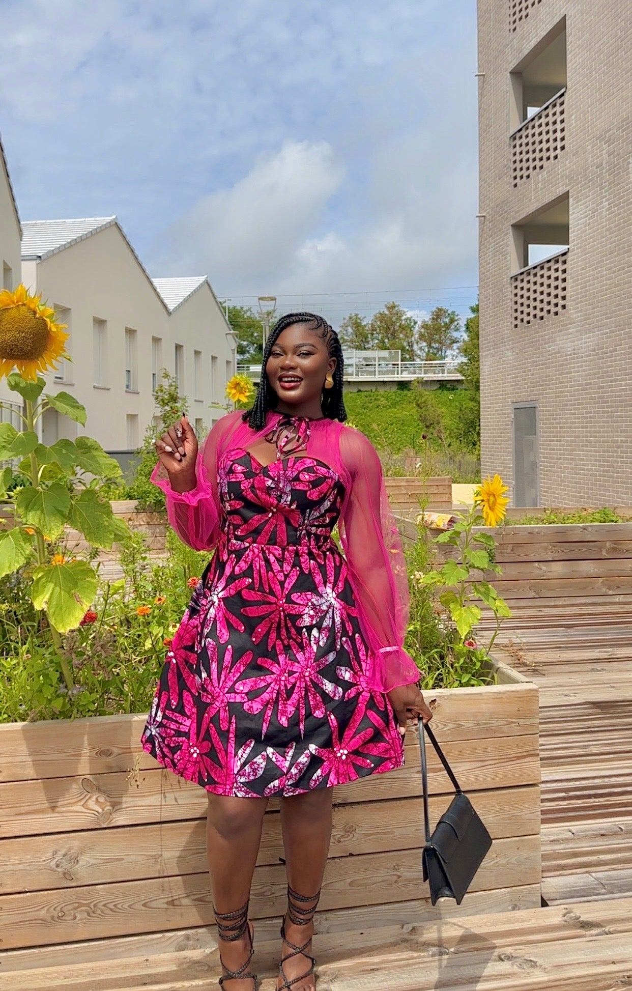 Sublimez votre silhouette avec cette robe exceptionnelle en tissu africain wax, alliant modernité et tradition. Conçue avec soin, “Fleur de Grâce” se distingue par ses motifs floraux éclatants fuchsia sur fond noir profond, qui rappellent la richesse de l’art textile africain.