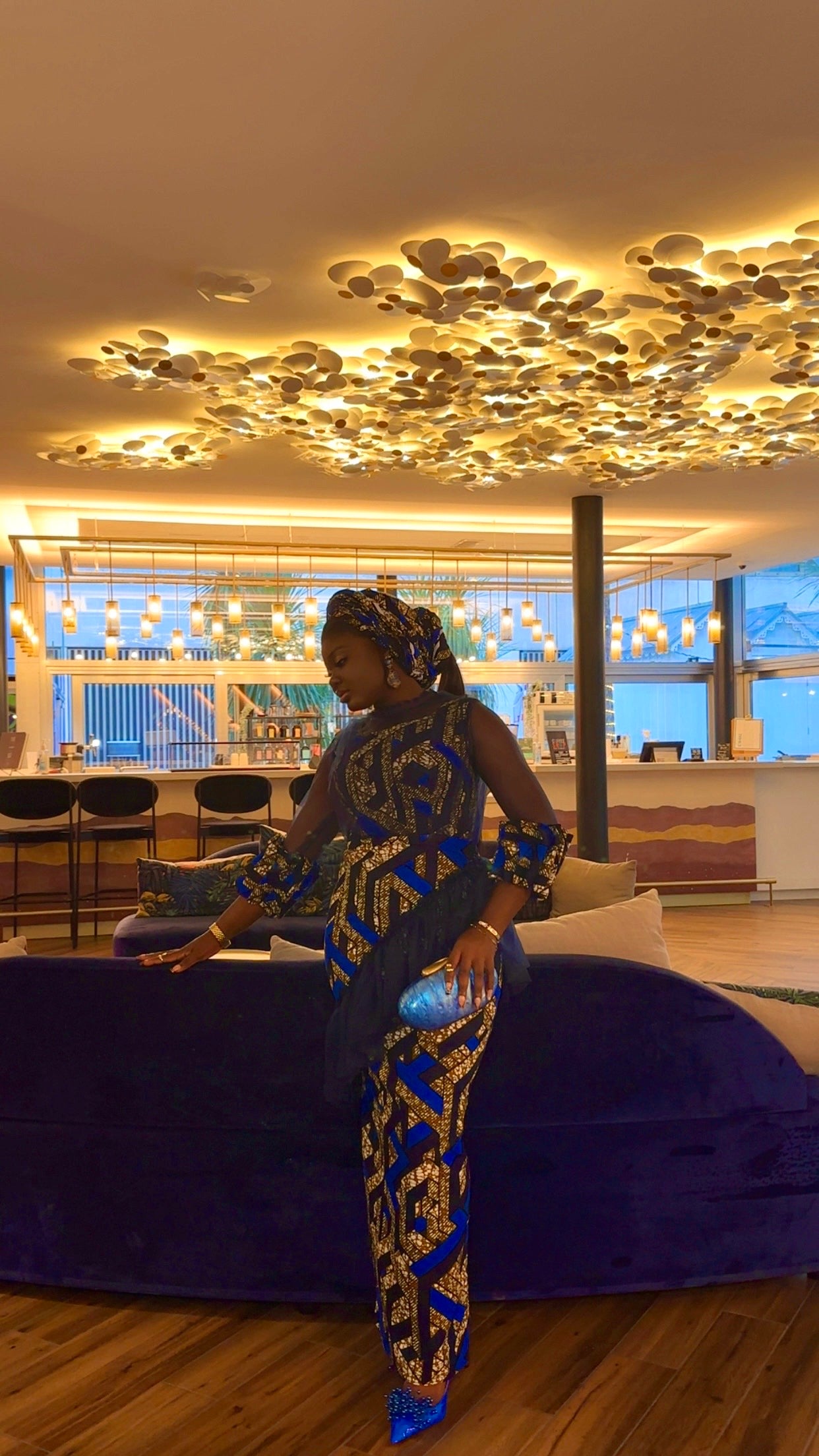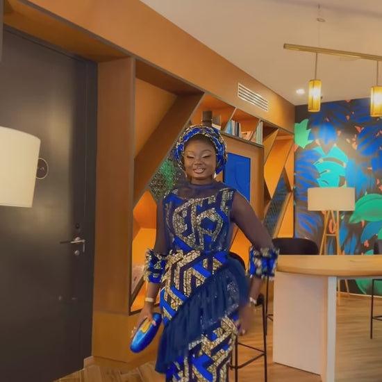 Ses motifs géométriques dorés sur fond bleu profond symbolisent la force, la noblesse et la fierté africaine.