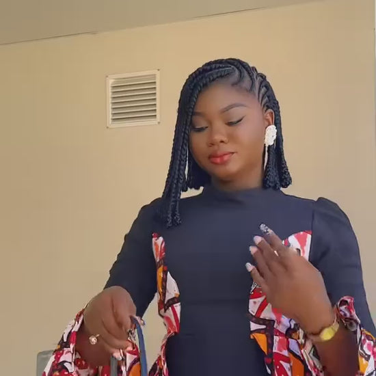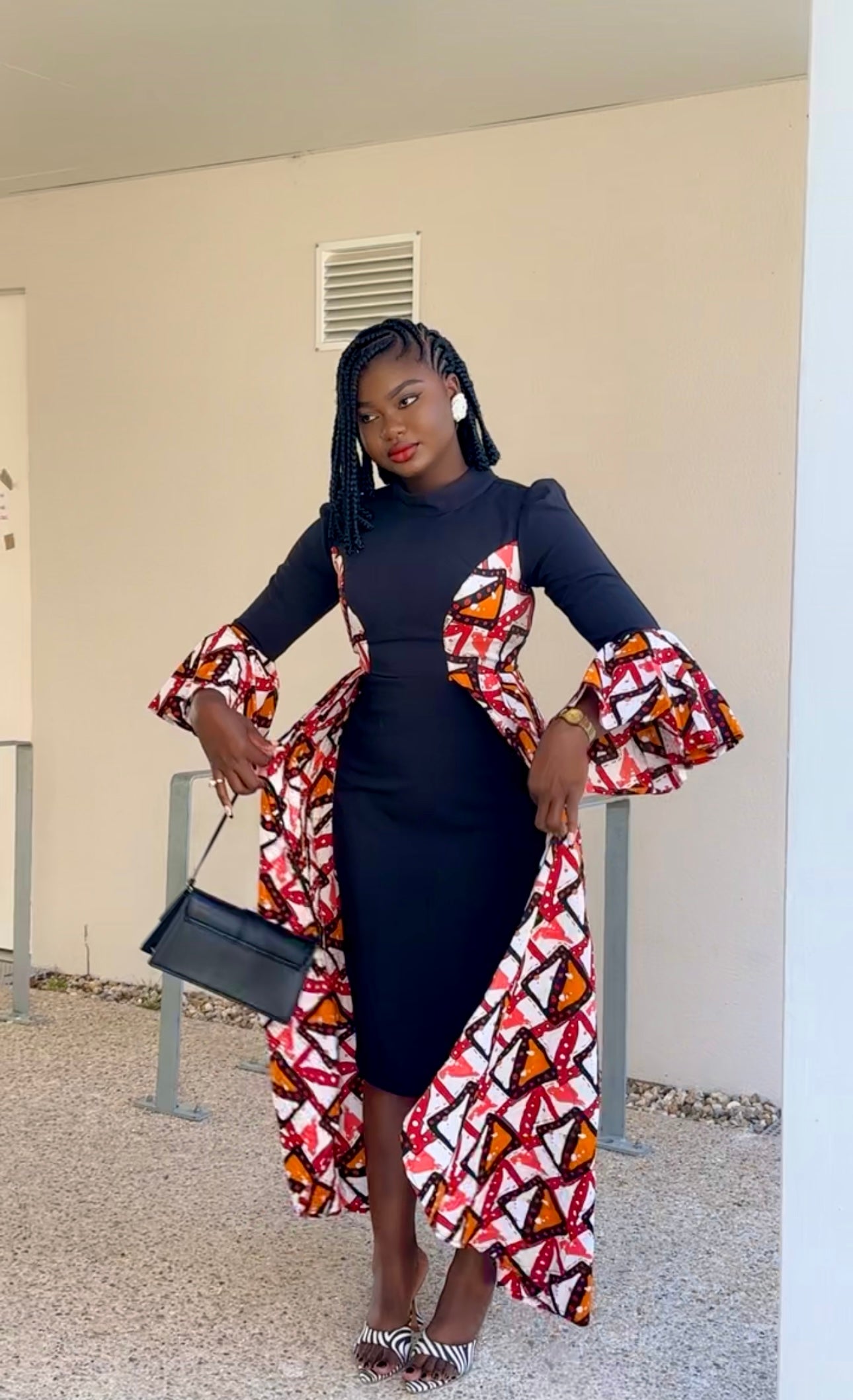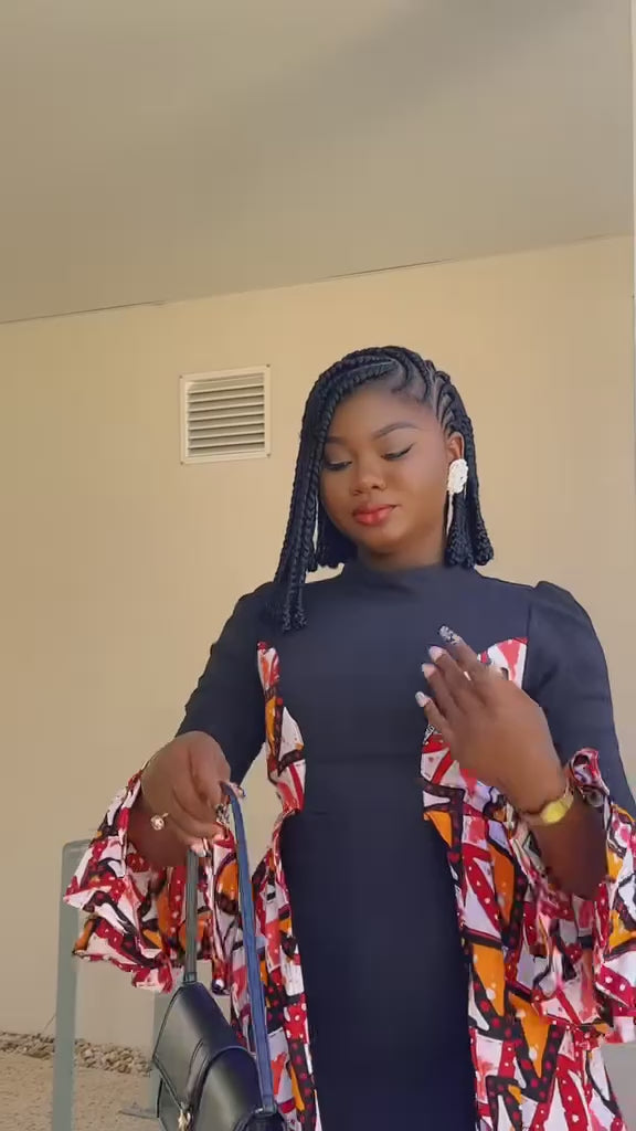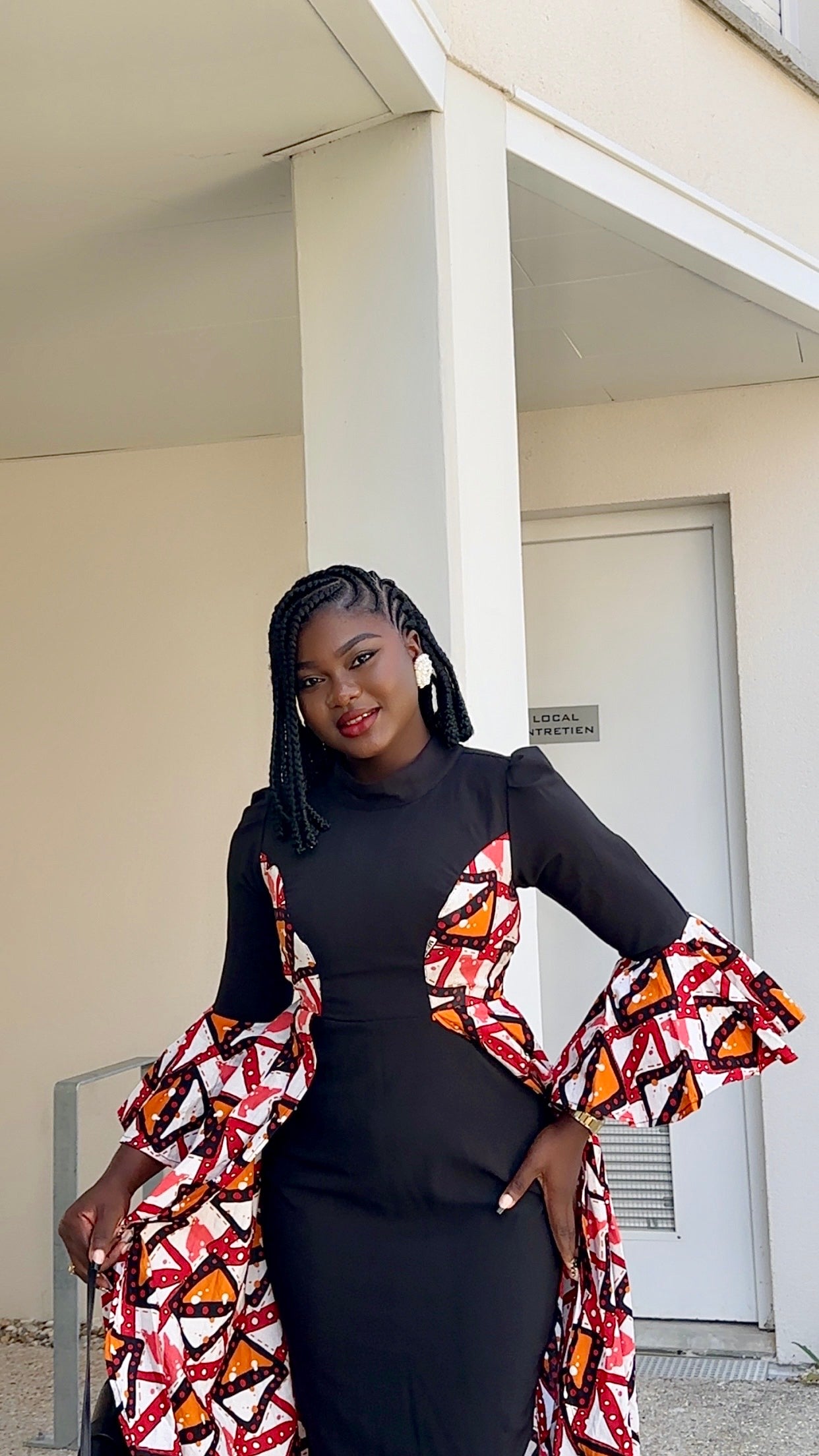 Sublimez votre allure avec cette robe noire élégante accompagnée d’un manteau long en wax africain aux motifs vibrants. La coupe ajustée de la robe met en valeur la silhouette avec raffinement, tandis que le manteau apporte une touche d’originalité et de culture grâce à ses imprimés géométriques colorés (rouge, blanc, noir et orange).
